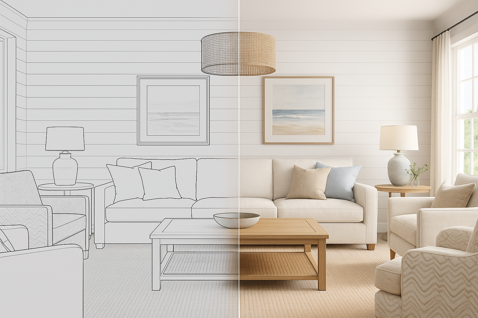 In addition to in-person projects across Florida, we offer full virtual design services — giving clients anywhere access to our signature coastal-modern aesthetic. Using industry-standard programs like SketchUp and V-Ray, we provide photorealistic renderings, curated finish schedules, and collaborative visuals that bring your space to life before the first install.